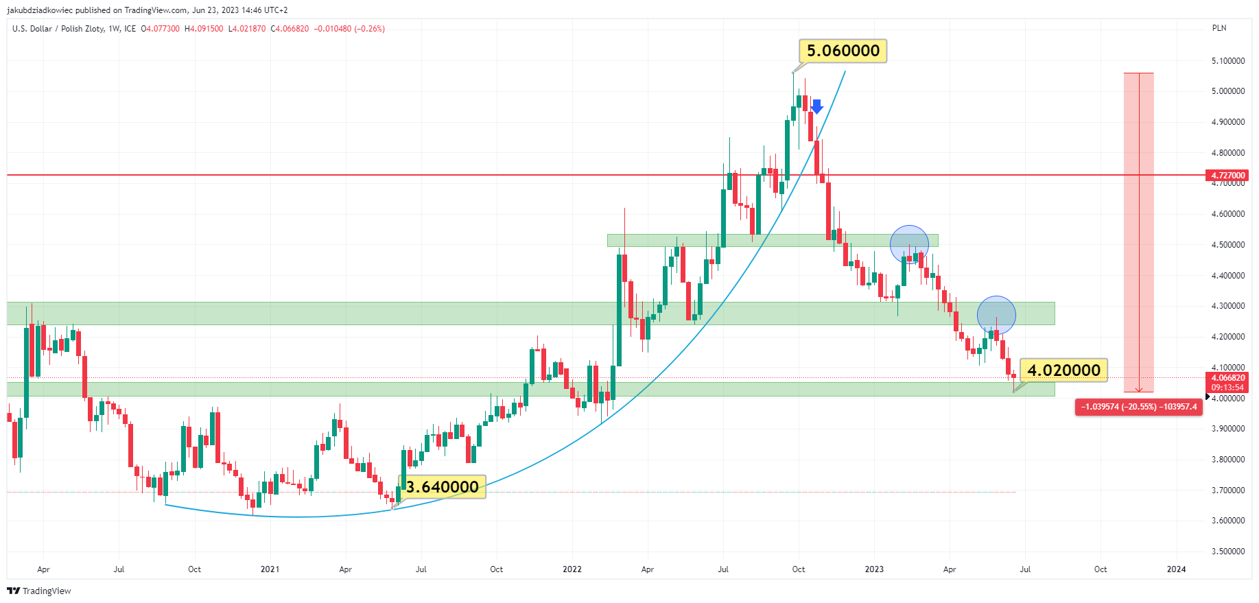 Trend spadkowy został zainicjowany po tym, jak dolar w parze do polskiego złotego załamał się z długoterminowej, parabolicznej linii wsparcia w październiku 2022 roku (niebieska strzałka). Wcześniej linia ta obowiązywała od początku 2021 roku i dołka na poziomie 3,64 PLN z maja 2021 roku. Od tamtego czasu USD wzrastał i osiągnął 5,06 PLN we wrześniu 2022 roku.
