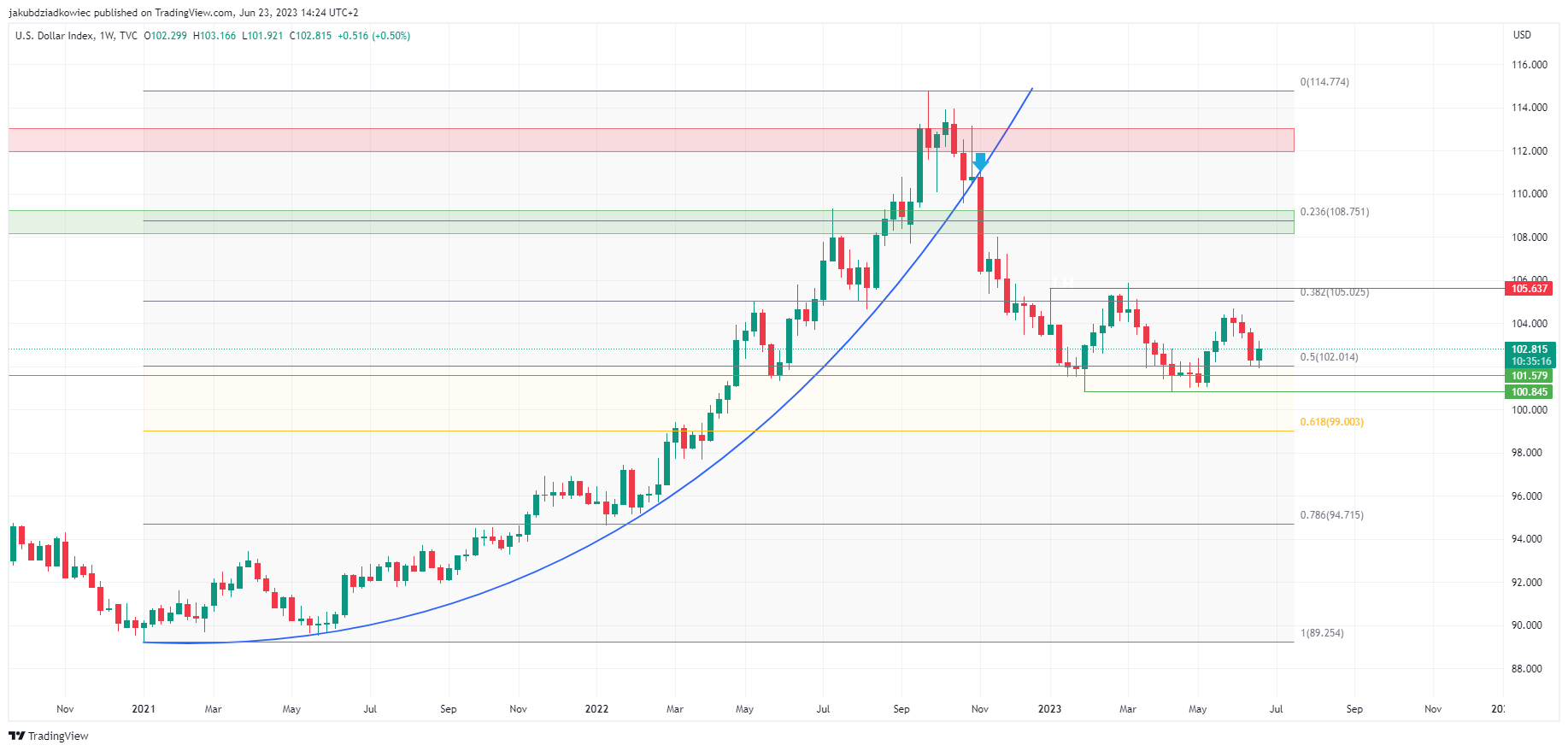 W listopadzie 2022 roku DXY załamał się z parabolicznej linii trendu wzrostowego (niebieska strzałka), która obowiązywała od początku 2021 roku. Wzrost indeksu dolara amerykańskiego, który trwał przez prawie 2 lata, doprowadził do 20-letniego szczytu na poziomie 114,8.
