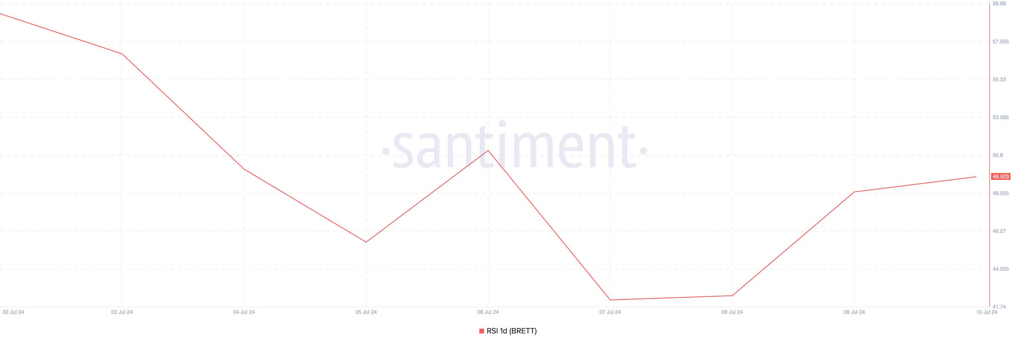Pod wpływem ogólnego spadku aktywności na rynku altcoinów, popyt na BRETT zmalał w ostatnich tygodniach. Wskaźnik siły względnej (RSI) pokazuje, że obecnie presja sprzedaży przewyższa wszelką aktywność kupna. W chwili pisania tego tekstu, wartość RSI wynosi 49,52 i znajduje się poniżej neutralnej linii 50.