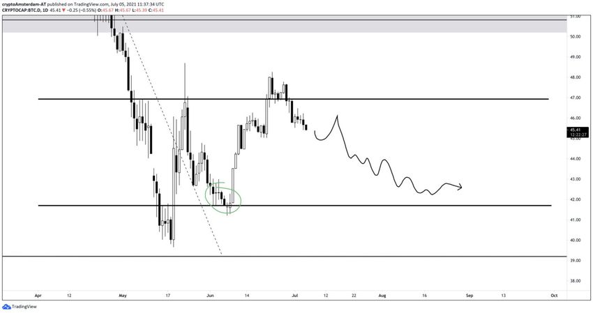 BTCD porusza się w dół od 3 stycznia, kiedy to osiągnął lokalne maksimum na poziomie 73,63%. Do tej pory wielokrotnie dotykał linii, ostatnio 27 czerwca.