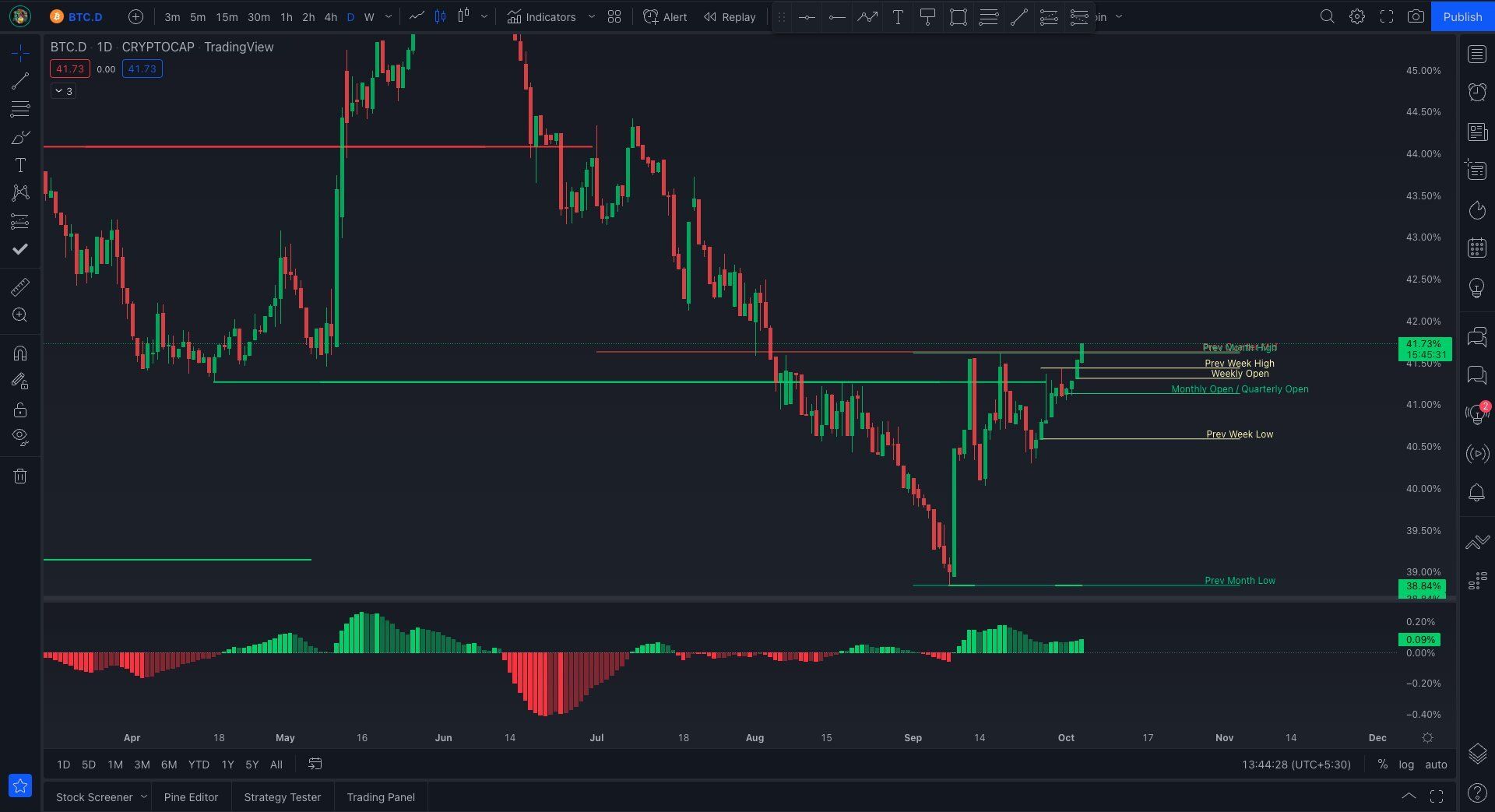 Aktualnie dominacja Bitcoina walczy o wybycie powyżej mniejszego obszaru oporu na 41,50%. Jeżeli to się powiedzie, to pierwszym obszarem oporu jest zakres 42,50-43%. Znajduje się on w konfluencji z opadającą linią oporu oraz poziomem zniesienia 0,382 Fib.