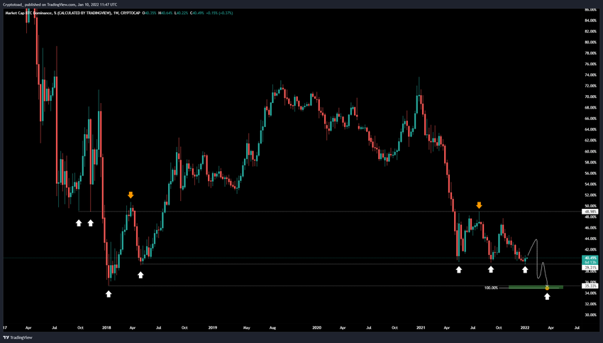 Trader kryptowalutowy @Mesawine1 opublikował na Twitterze wykres BTCD, stwierdzając, że token prawdopodobnie wzrośnie w kierunku nowego all-time low.