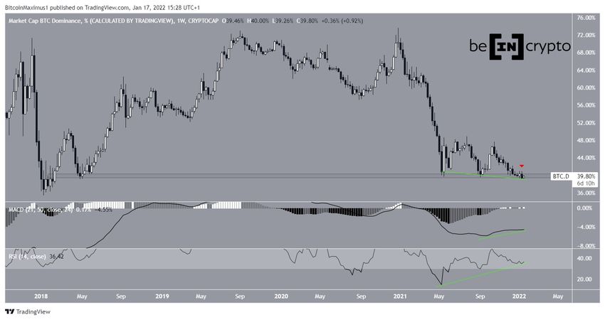 BTCD gwałtownie spada od stycznia 2021 roku, kiedy to właśnie osiągnął wysoki poziom 73,63%. Od początku maja unosi się tuż nad 40% horyzontalnym obszarem wsparcia, który który utrzymuje się od 2018 roku.