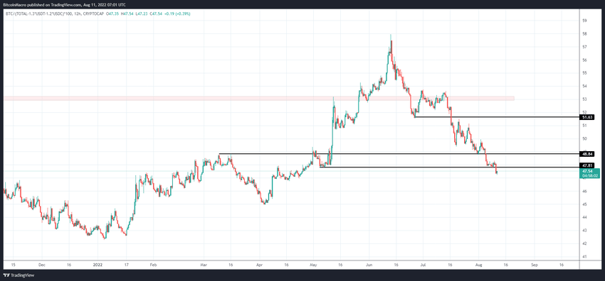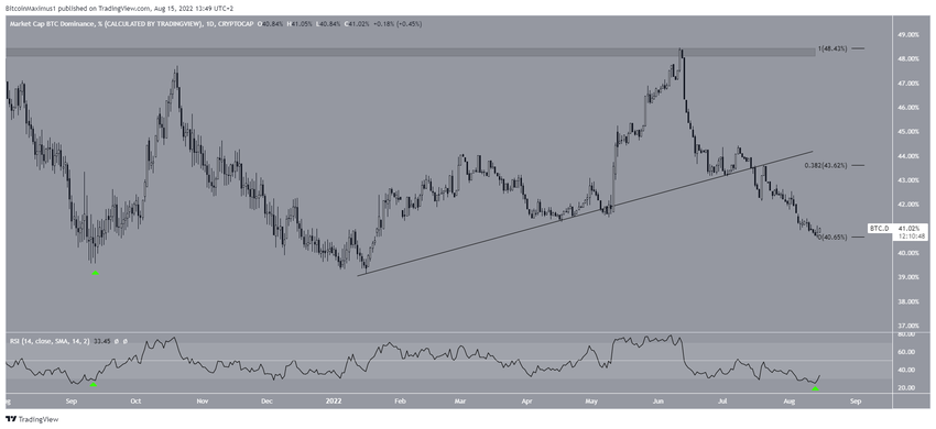 SponsoredPodczas gdy początkowo doprowadziło to do ruchu w górę, który zaprowadził BTCD do szczytu na poziomie 48,45%, od tego czasu kurs spada. Ponadto, załamała się ze swojej linii trendu byczej dywergencji i linii 50 na początku sierpnia.