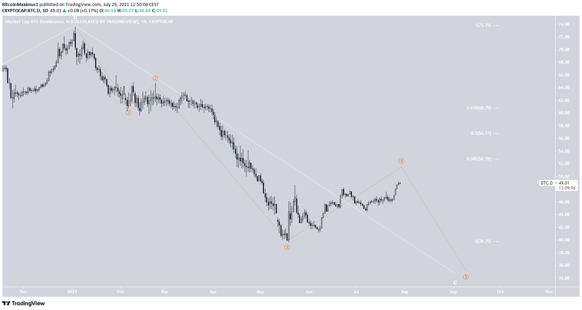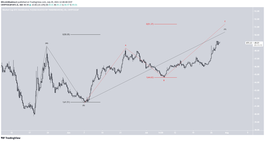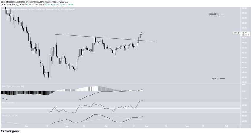 Wskaźnik Dominacji Bitcoina wybił się już z opadającej linii oporu i osiągnął szczyt na poziomie 49,16%, co jest najwyższą wartością osiągniętą od początku maja.