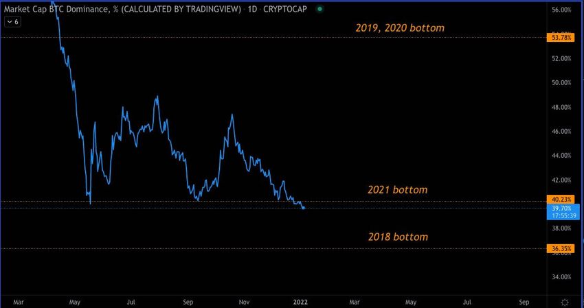 Według TradingView, dominacja Bitcoina spadła do 39,48% w dniu 3 stycznia. Nie była tak niska od maja 2018 roku, kiedy wynosiła około 39,18%. We wrześniu 2021 roku dominacja Bitcoina spadła z powrotem poniżej 40% przed odbiciem i ponownym spadkiem w drugiej połowie roku.