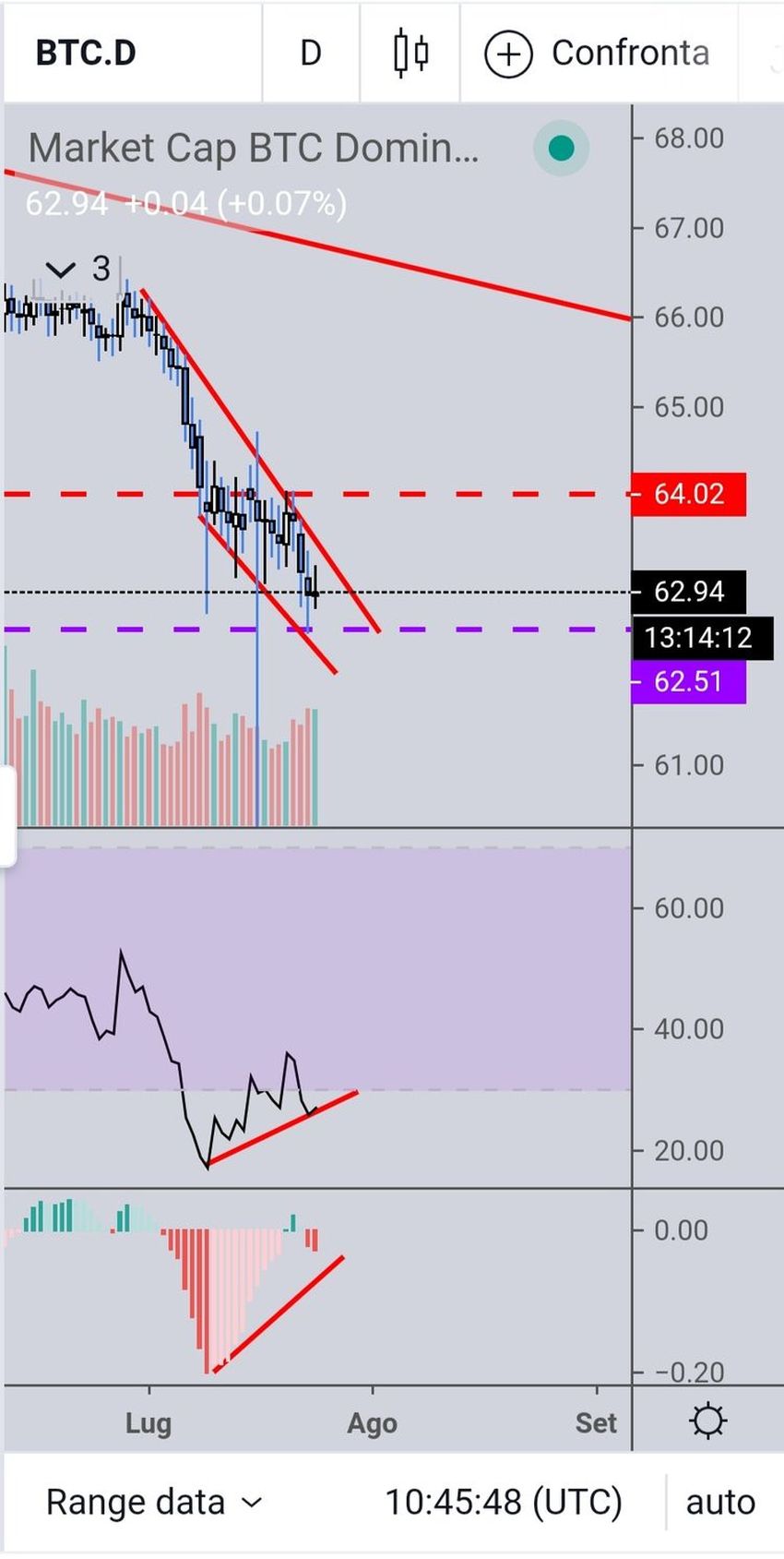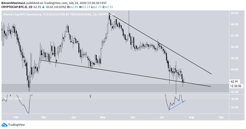 Oznacza to, że szybki wzrost BTC powoduje spadek BTCD i odwrotnie. Jeśli ta zależność zostanie utrzymana, cena BTC musiałaby spaść, aby cena BTCD wzrosła.