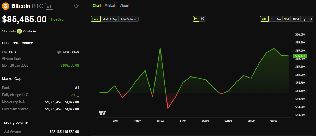 Dane BeInCrypto pokazują, że Bitcoin był notowany po 85 465 USD w momencie pisania tego tekstu. To oznacza skromny wzrost o 1,09% w ciągu ostatnich 24 godzin.