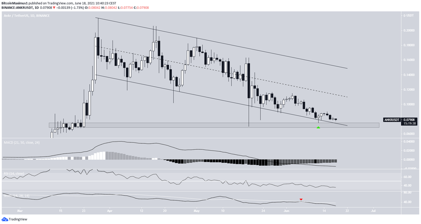 ANKR spada wzdłuż opadającego kanału równoległego od czasu osiągnięcia rekordu wszech czasów na poziomie 0,216 USD w dniu 28 marca. Ostatnio został odrzucony przez linię oporu w dniu 1 maja.