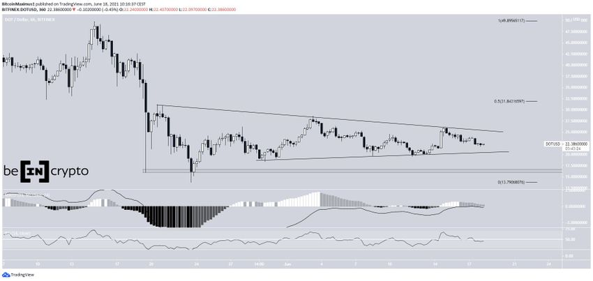 DOT wzrasta od dnia 23 maja, kiedy osiągnął dołek na poziomie 13,73 USD. Od tego czasu, kurs porusza się wewnątrz trójkąta symetrycznego, który jest uważany za neutralną formację. Obecnie zbliża się do punktu zbieżności między oporem a wsparciem, dlatego zdecydowany ruch musi nastąpić wkrótce.