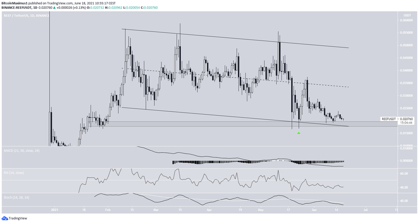 Podobnie jak DOT, REEF jest notowany wewnątrz opadającego kanału równoległego. Dzieje się tak od dnia 11 lutego. W dniu 23 maja dotarł do linii wsparcia kanału i odbił się.