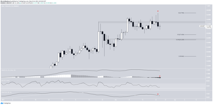 UNI osiągnął nowy ATH o wartości 36,80 USD w dniu 23 marca, ale zaraz potem gwałtownie spadł.