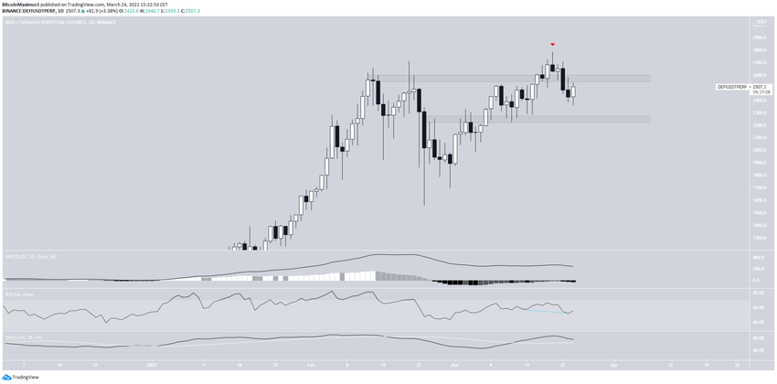 Ruch indeksu DeFi jest podobny do ruchu UNI. Po tym, jak w dniu 20 marca osiągnął nowy ATH na 2786 USD, nastąpił spadek.