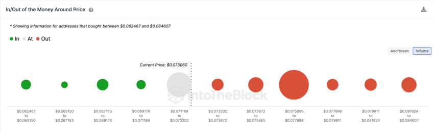 Według platformy analitycznej IntoTheBlock, najbardziej prawdopodobną prognozą dla ceny DOGE jest spadek do 0,07 USD. 56 870 adresów posiadających 853 miliony tokenów może zapewnić mu znaczące wsparcie w tej kluczowej strefie. Jeśli jednak osłabnie, meme coin odnotuje dalszy spadek w kierunku 0,062 USD.