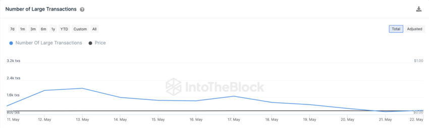 Poniższy wykres pokazuje, że liczba dużych transakcji zaczęła spadać około 13 maja. Zbiega się to ze wzrostem zainteresowania DRC-20 i oznacza, że wieloryby omijają Dogecoina z powodu zatorów i wzrostów opłat.
