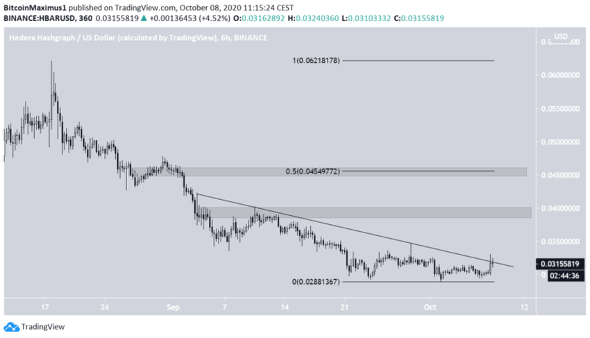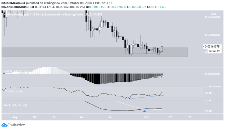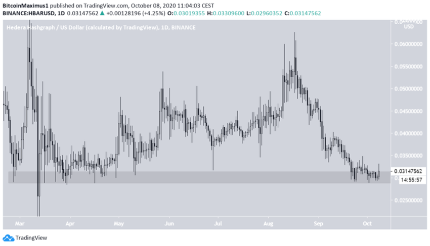 Cena HBAR znajduje się obecnie w obszarze wsparcia na 0,03 USD, który utrzymuje się od marca. Chociaż cena zapoczątkowała kilka ruchów w górę, wszystkie okazały się nieskuteczne, a ostatni osiągnął maksimum na 0,062 USD.