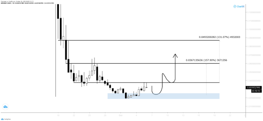 Od tego czasu cena rosła i w dniu 5 października ponownie osiągnęła poziom 0,035 USD. Tym razem jednak poziom ten działał jako opór i odrzucił cenę, powodując gwałtowny spadek.