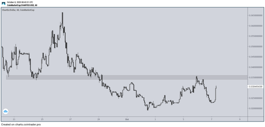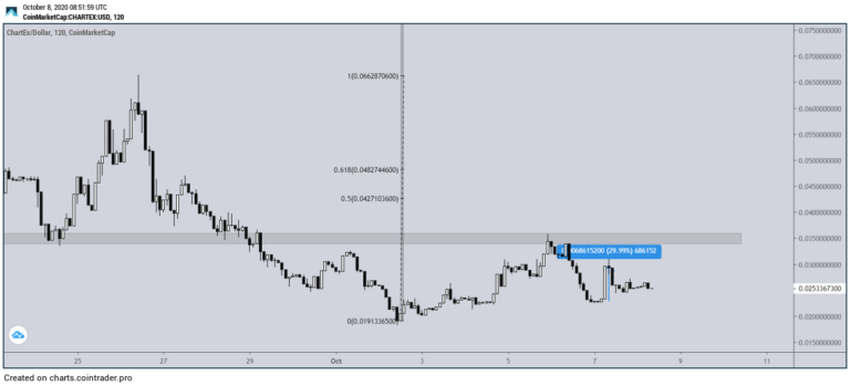Cena CHART spadała od chwili, gdy w dniu 24 września osiągnęła maksimum na 0,066 USD. W dniu 29 września cena spadła poniżej obszaru wsparcia na 0,035 USD i trzy dni później osiągnęła dołek na 0,019 USD.