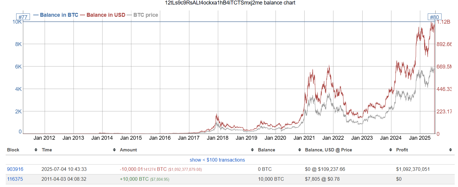 Ten portfel nie wykazywał aktywności przez ponad dekadę. Następnie, wczesnym rankiem 4 lipca 2025 roku, wszystkie te monety BTC zostały przeniesione.
