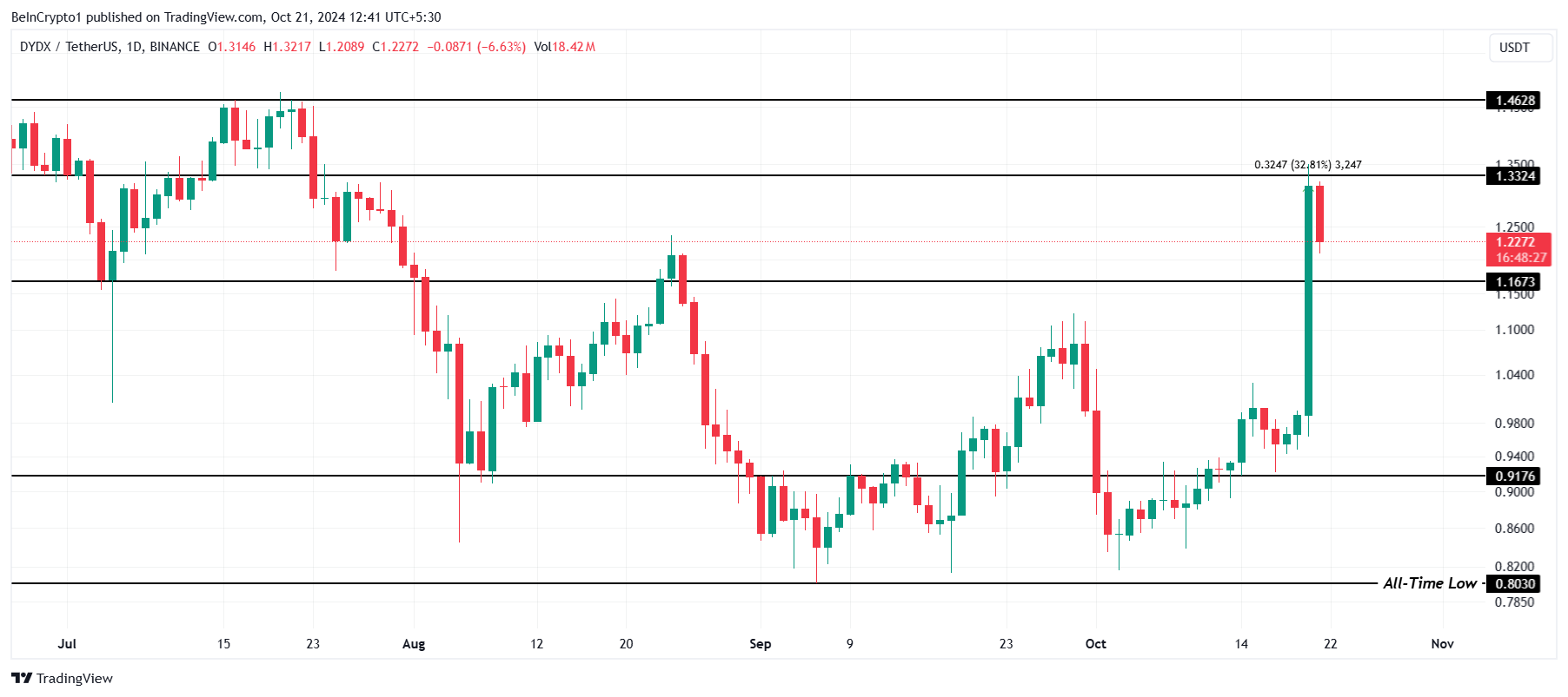 Po wzroście o 32% w niedzielę, cena DYDX ustabilizowała się tuż poniżej ważnego poziomu oporu na 1,33 USD. Jednakże tylko dzisiaj aktywo spadło o 6%, głównie z powodu wspomnianej realizacji zysków. Ten spadek sugeruje, że ostatni wzrost mógł na razie dotrzeć do lokalnego szczytu.