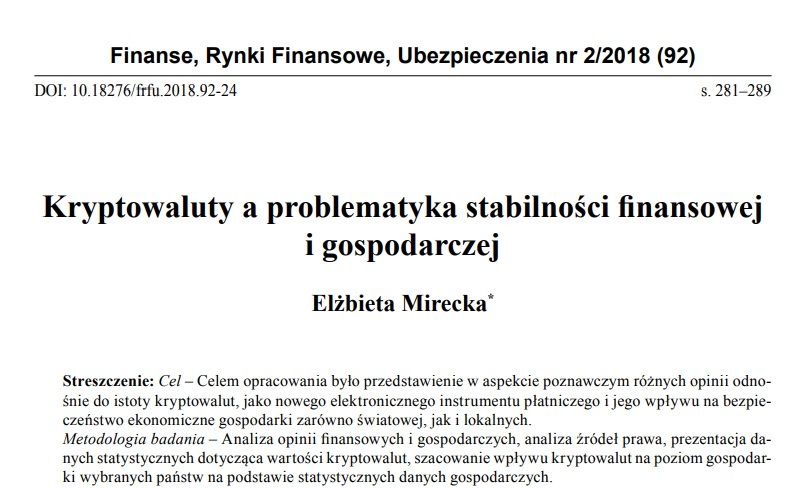 Twierdzenie to zdają się potwierdzać badania polskich naukowców nad kryptowalutami w kontekście stabilności finansowej. Opublikowany jeszcze w 2018 roku artykuł Elżbiety Mireckiej pt. „Kryptowaluty a problematyka stabilności finansowej i gospodarczej” wskazał, że pomimo coraz większej rangi tej klasy aktywów cyfrowych, wiele podmiotów odmawiało im traktowania na równi z tradycyjnymi aktywami.