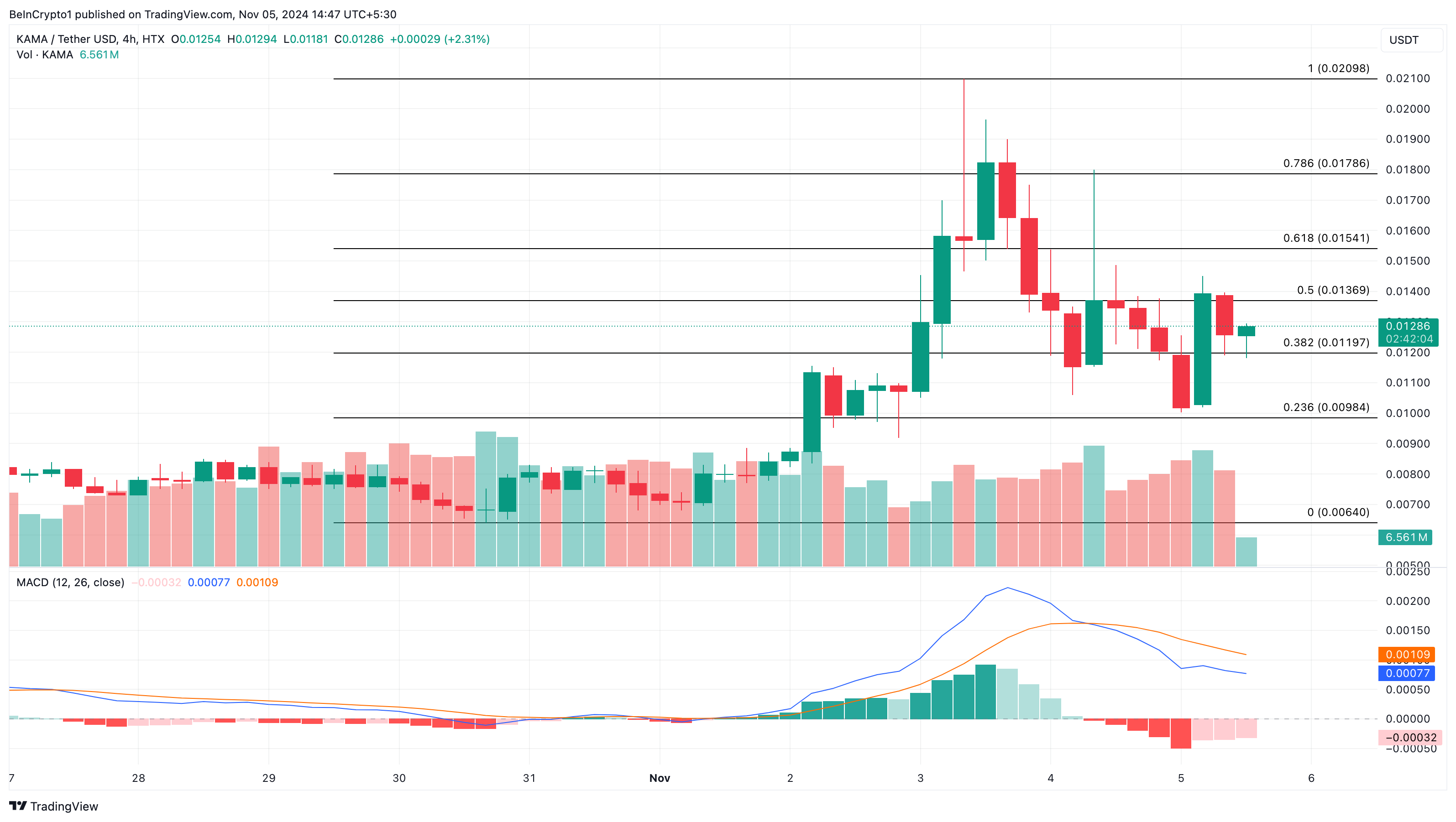 Ponadto 12-dniowa wykładnicza średnia ruchoma (EMA) w kolorze niebieskim przecięła się poniżej 26 EMA (pomarańczowy). Sugeruje to, że sprzedający mają kontrolę. Jeśli ten trend się utrzyma, cena KAMA może spaść do 0,0098 USD.