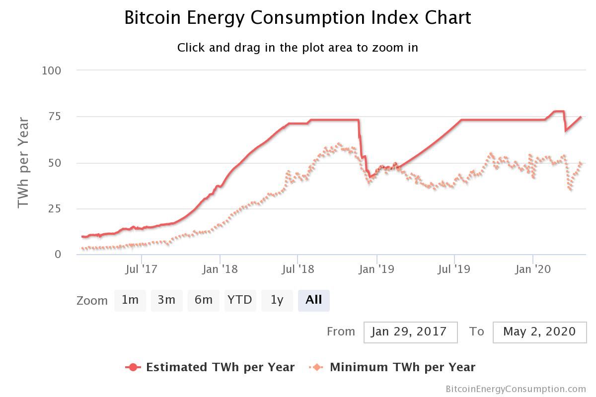 Niemało zużywa też sieć Bitcoina, która konsumuje niemal 75 TWh rocznie, co stanowi niemal połowę zużycia w całej Polsce (ok. 155 TWh).