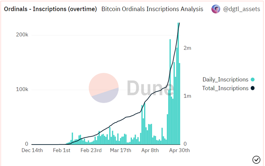 Według danych analitycznych Dune, liczba napisów na Bitcoinie przekracza obecnie 2,5 miliona – 29 kwietnia osiągnęła dzienny szczyt wszechczasów w postaci 223 311 zapisów.