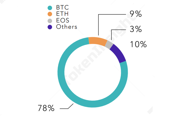 Jak wcześniej wspomniano, Bitcoin (BTC), Ethereum (ETH) i EOS (EOS) stanowią 90 procent wolumenów kontraktów futures, a sam Bitcoin zajmuje 78 procent rynku.
