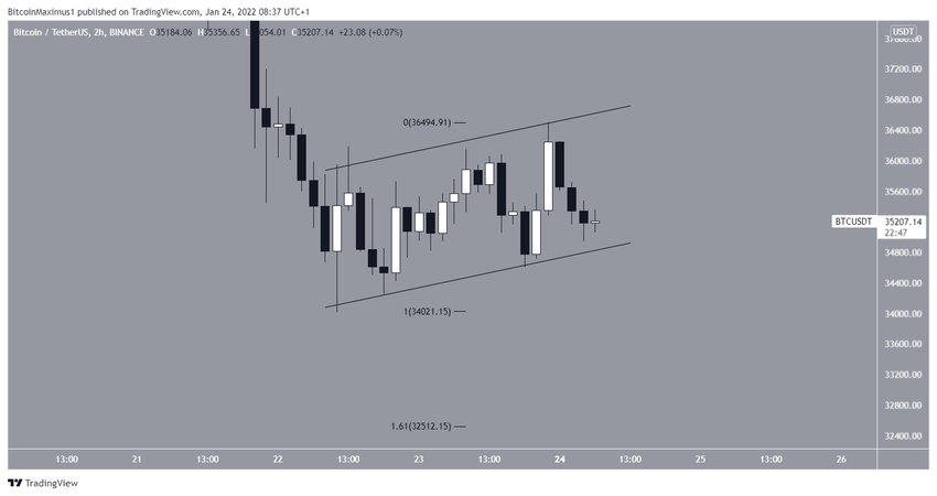 Wykres dwugodzinny pokazuje, że Bitcoin handluje wewnątrz wznoszącego się kanału równoległego od dnia 22 stycznia. Takie kanały często zawierają ruchy korekcyjne, co oznacza, że ewentualne wybicie z niego byłoby prawdopodobne.