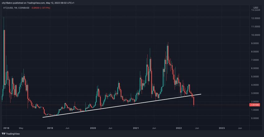 Trader kryptowalutowy @CryptosStack opublikował na Twitterze wykres Tezos, który pokazuje załamanie z wieloletniej linii trendu. Jak wspomniano powyżej, linia ta utrzymywała się przez prawie trzy lata przed załamaniem.