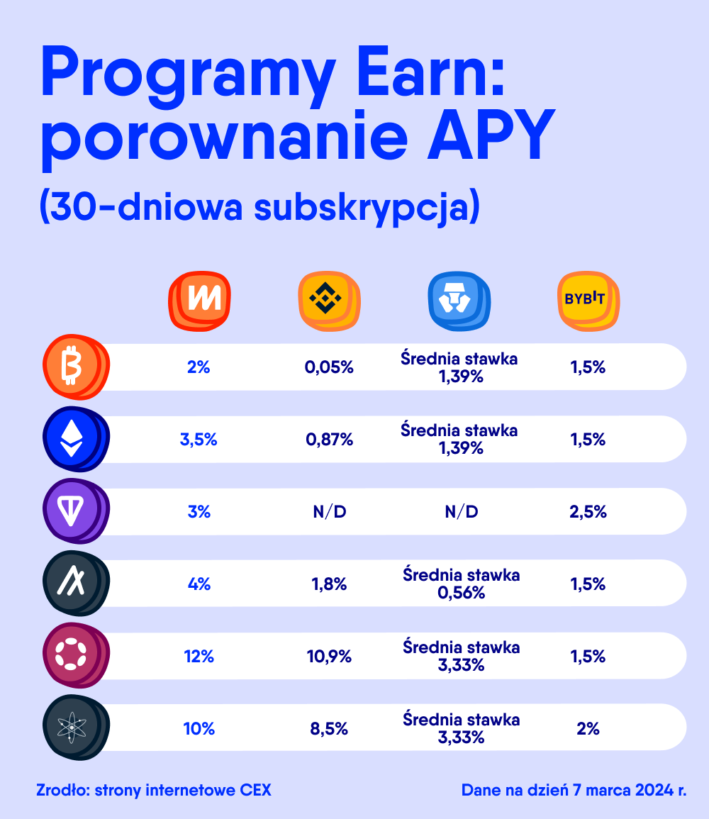 Poniższa tabela zawiera kursy niektórych z najpopularniejszych aktywów w programie Earn. Porównuje je z innymi scentralizowanymi giełdami kryptowalut na dzień 7 marca 2024 roku. Porównania dokonano dla programów o podobnych warunkach, takich jak zwykły Earn (bez stakingu on-chain) z okresem blokującym wynoszącym 30 dni lub elastycznym terminem, jeśli nie ma ustalonego czasu trwania.