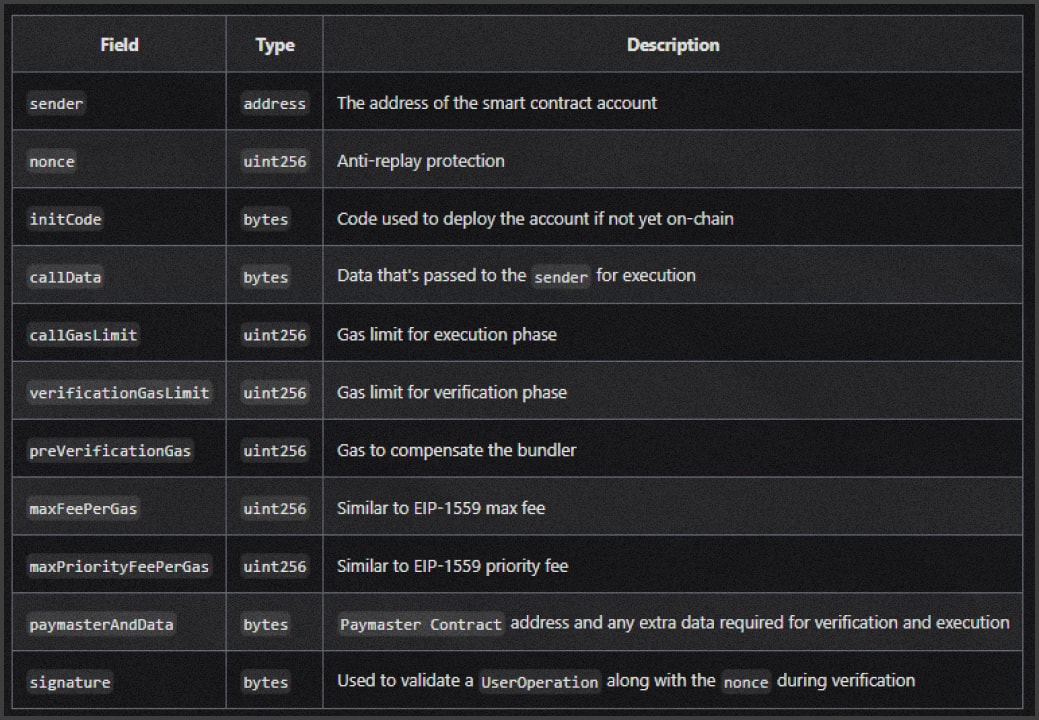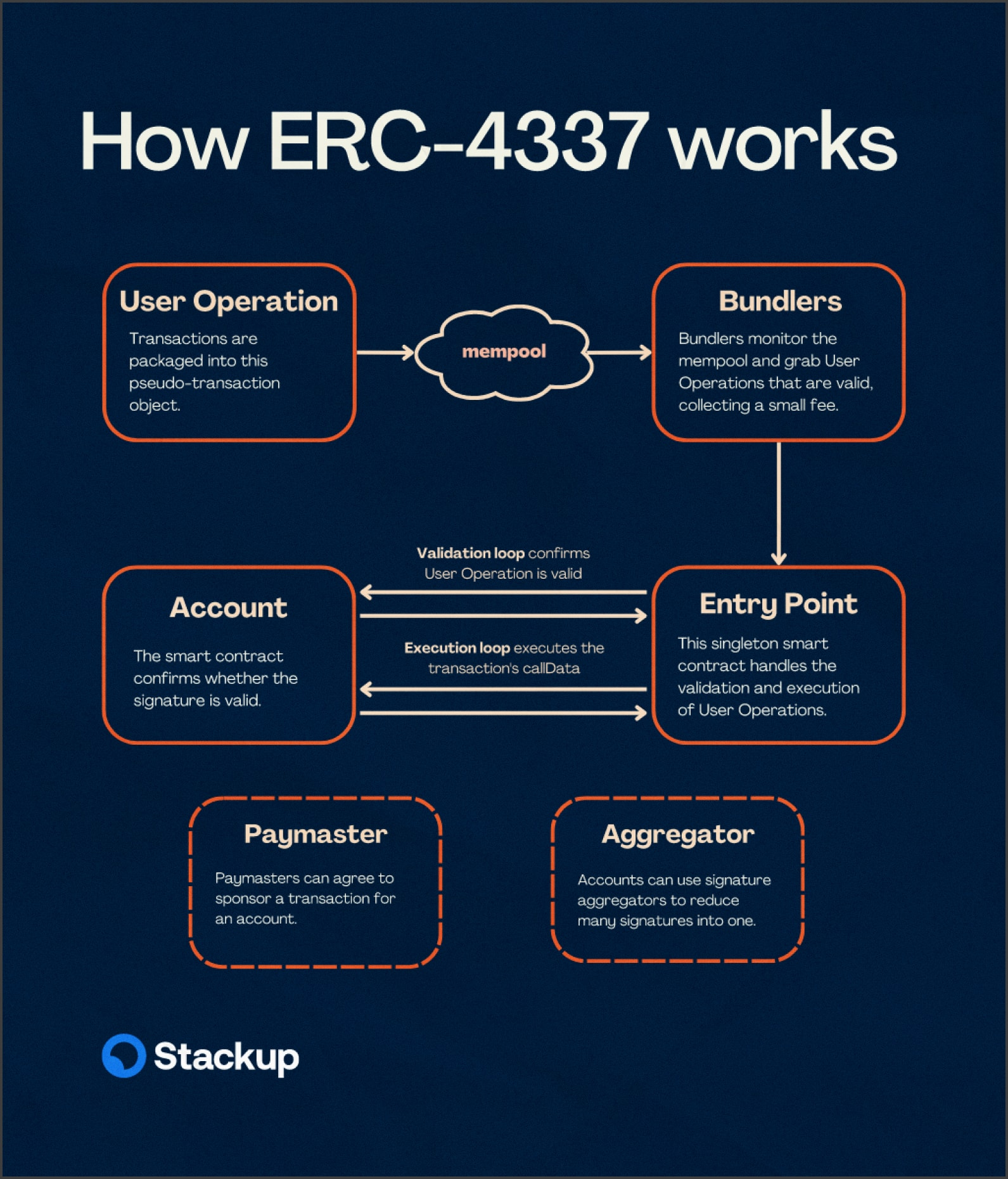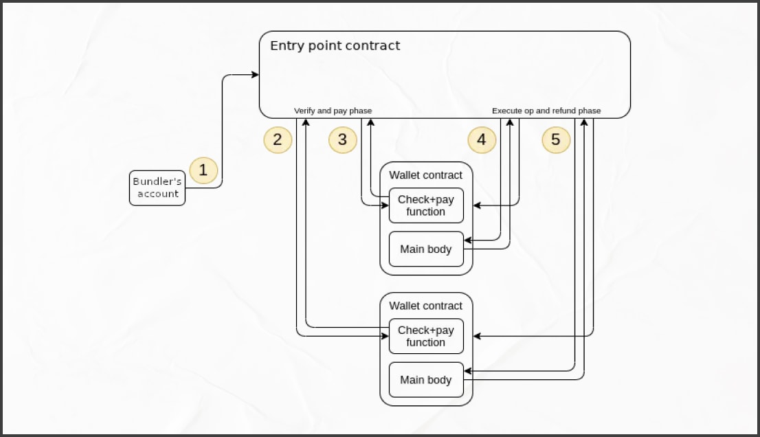 Użytkownik inicjuje UserOperation poprzez aplikację portfela (usługę udostępniającą interfejs), która jest wysyłana do dedykowanego mempoola. Jeśli jest to pierwsza transakcja, a użytkownik nie posiada adresu inteligentnego portfela, EntryPoint wdroży go automatycznie.