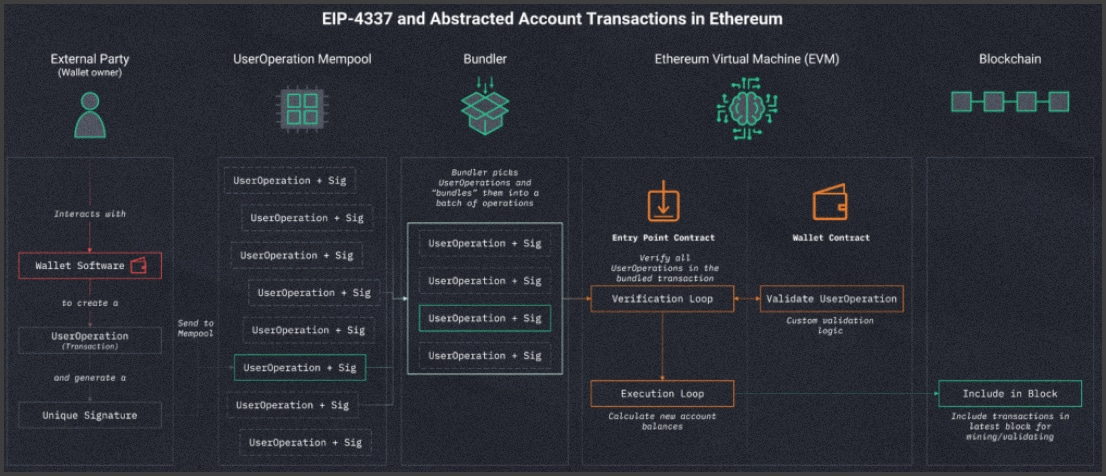 EIP-4337 powinien wyeliminować nadpisywanie EOA i uczynić CA wygodniejszym poprzez dodanie nowego standardu portfela do sieci Ethereum w postaci inteligentnego kontraktu i nowej warstwy, która umożliwi przeprowadzanie i weryfikację transakcji bez użycia klucza prywatnego i publicznego. Aby to zrobić, deweloperzy zaimplementowali coś, co znane jest jako abstrakcja konta.