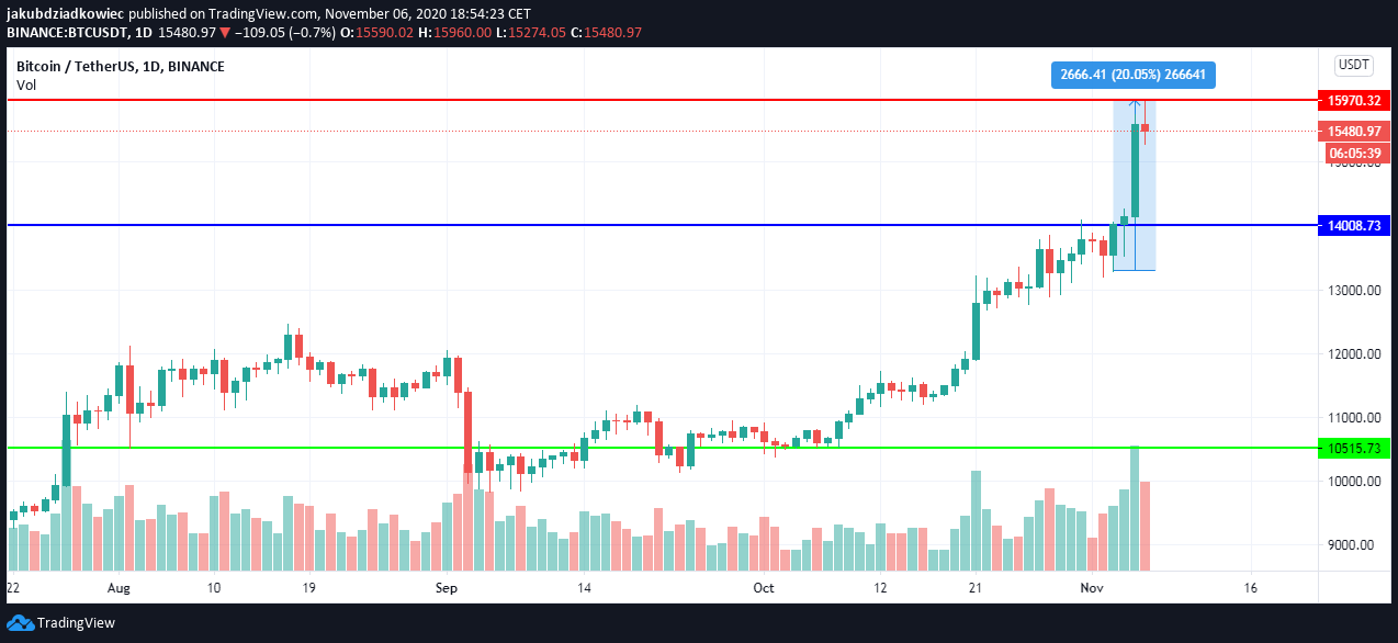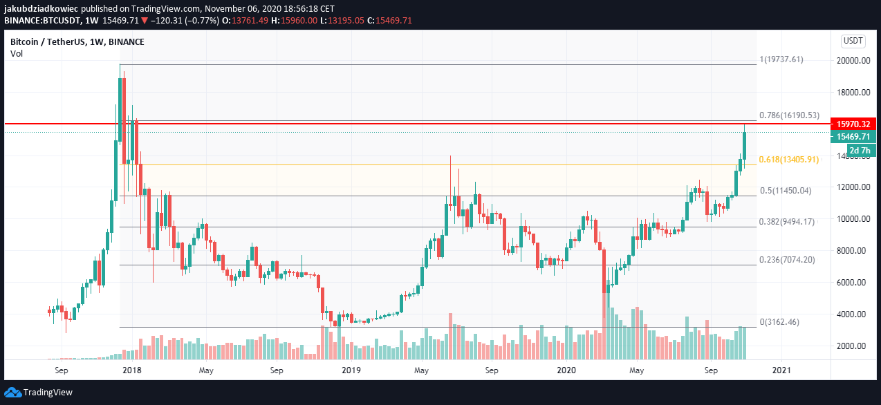 Pomiędzy 3 a 6 listopada cena Bitcoina (BTC) wzrosła o 20% licząc od dołka na 13 284 USD do wczorajszego szczytu na 15 960 USD (czerwona linia). Stało się to w momencie, gdy wielu graczy spodziewało się krótkoterminowej korekty. Na początku października nastąpiło wybicie z obszaru 10 500 USD (zielona) i osiągnięcie ważnego obszaru oporo na 14 000 USD (niebieska), który był szczytem wzrostów z czerwca 2019 roku.