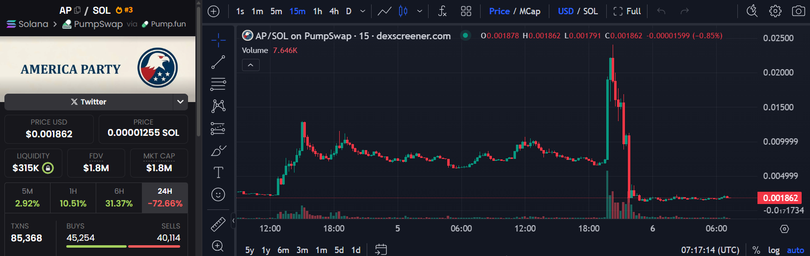 SponsoredW ciągu kilku godzin, memowy coin o nazwie America Party (AP) — stworzona na Pump.Fun — wzrosła o 120%, osiągając kapitalizację rynkową ponad 18 mln USD. Wolumeny handlowe gwałtownie wzrosły, gdy spekulanci rzucili się, licząc na wpływ i wiralność Muska.