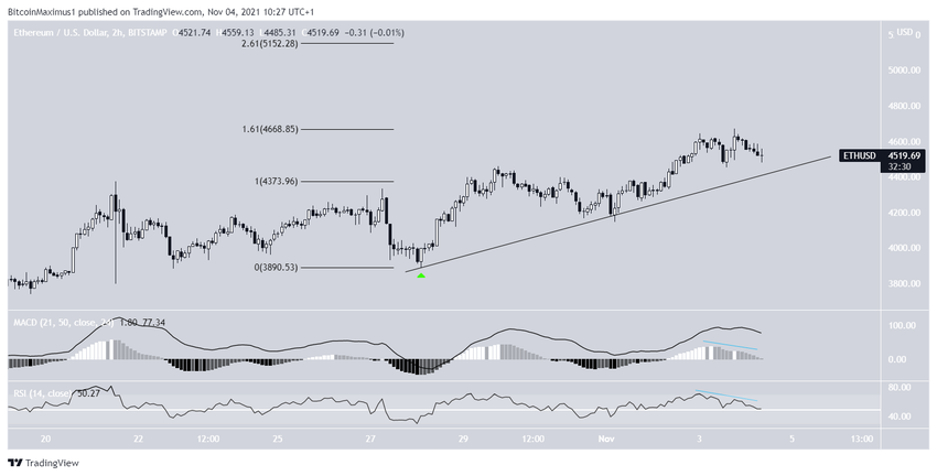 Podobnie jak BTC, ETH również podąża za wznoszącą się linią wsparcia, aczkolwiek o znacznie bardziej stromym nachyleniu. W dniu 3 listopada altcoin osiągnął szczyt na poziomie 4668 USD. Wkrótce potem jednak spadł, gdy RSI i MACD wygenerowały niedźwiedzie dywergencje.