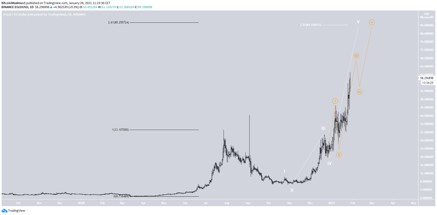 Ponadto wydaje się, że EGLD jest w przedłużonej fali piątej (pokazanej na biało poniżej). Dlatego po osiągnięciu szczytu należałoby oczekiwać znacznej korekty.