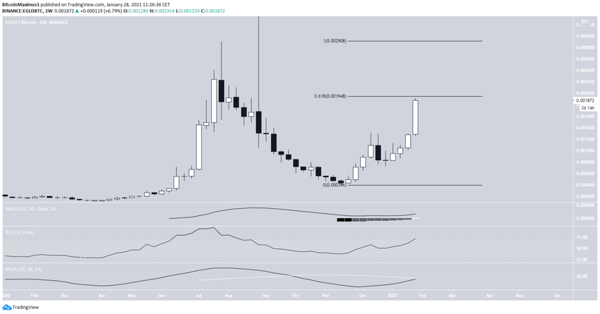 Podczas gdy wskaźniki techniczne wyglądają dobrze, EGLD musi usunąć poziom zniesienia 0,618 Fib w obszarze 0,00194 BTC, aby można było uznać trend za zwyżkowy.