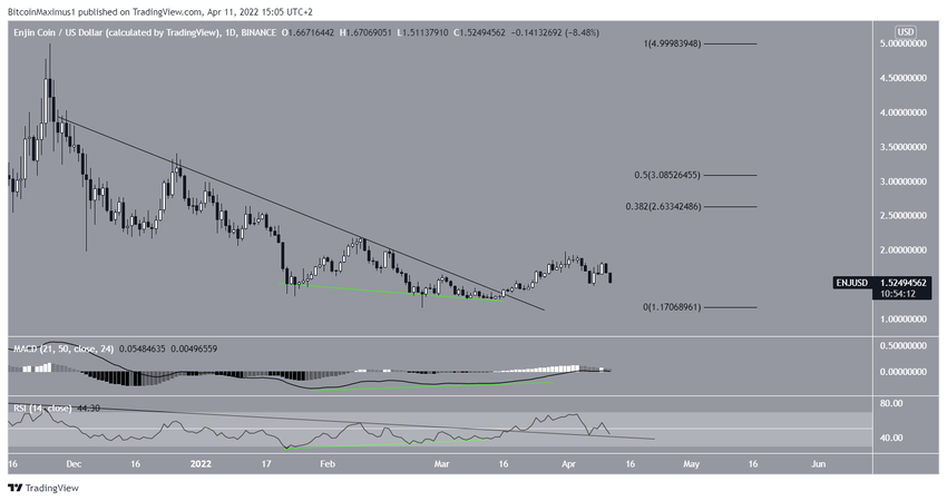 Wykres dzienny pokazuje, że Enjin Coin załamał się z opadającej linii oporu, po tym jak zarówno RSI jak i MACD wygenerowały znaczące bycze dywergencje (zielone linie).