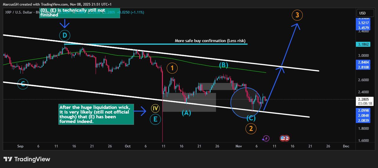 Pomimo tych ostrzegawczych sygnałów od Glassnode, część analityków technicznych pozostaje pozytywna. Jak zauważa DustyBC Crypto, na wykresie XRP/USD (interwał 8H) widać uspokojenie zmienności i ograniczony wolumen, co może poprzedzać większy ruch. Jego zdaniem wielu inwestorów instytucjonalnych „kupuje agresywnie”, gdy rynek detaliczny reaguje strachem. Analityk techniczny podzielił się:
