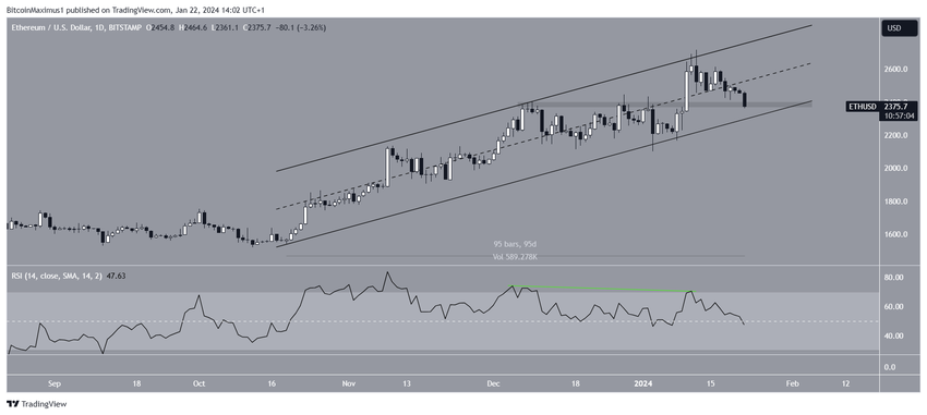 Analiza techniczna dziennych interwałów pokazuje, że cena ETH znajdowała się w rosnącym kanale równoległym przez ostatnie 95 dni. Ruch w górę doprowadził do osiągnięcia szczytu na poziomie 2717 USD w dniu 12 stycznia. Ten szczyt potwierdził linię trendu oporu kanału (czerwona ikona).