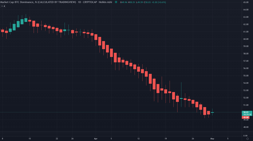 Oba projekty nadal osiągają nowe szczyty, podczas gdy dominacja Bitcoina spada. Spadek zauważalny jest prawie od miesiąca. Obecnie wynosi około 49,86%, spadając z poziomu 60,61% sprzed miesiąca.