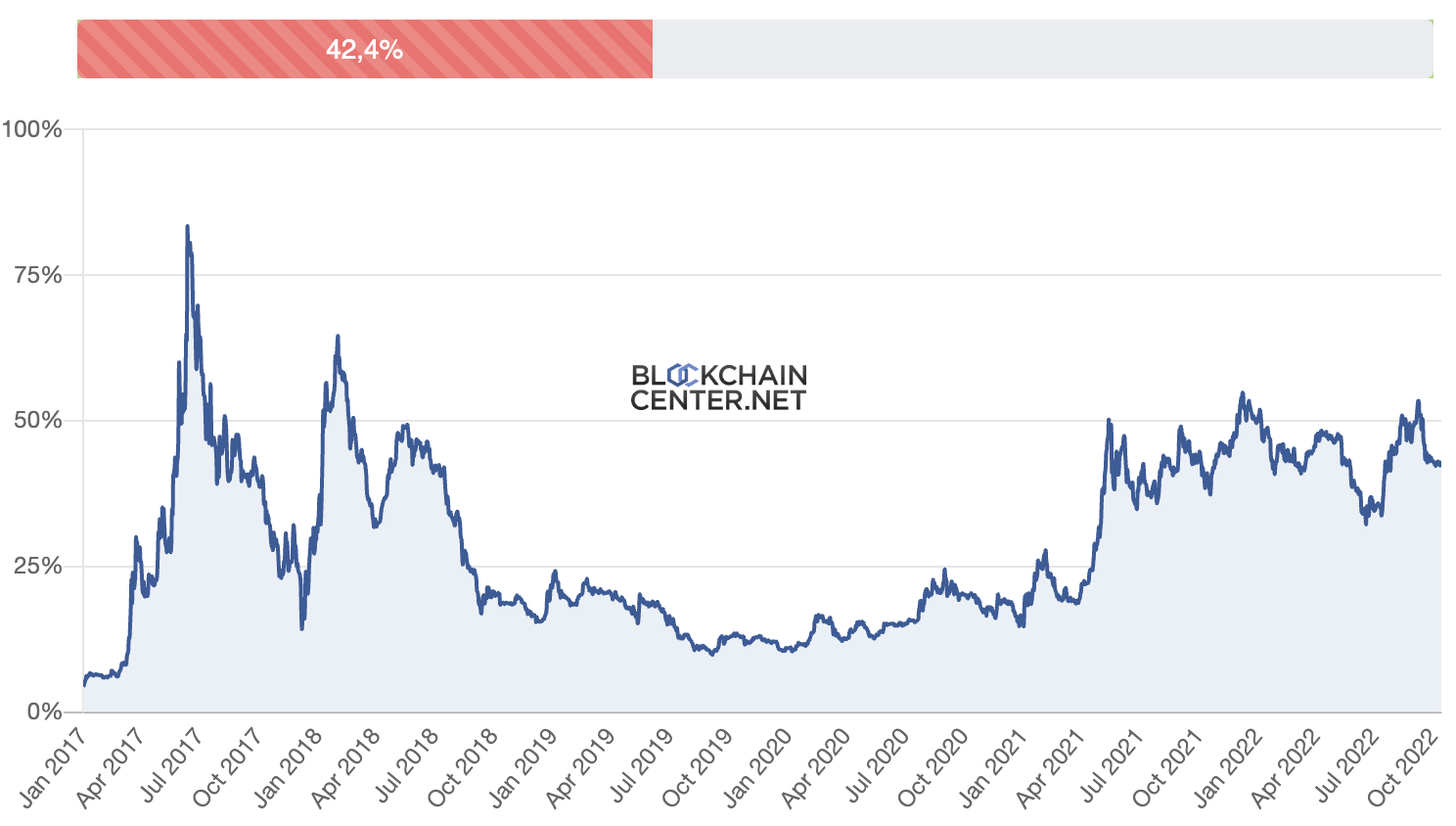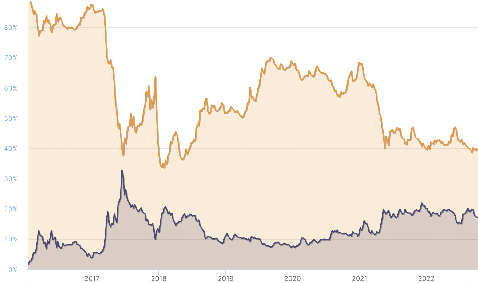 Jeśli zsumować łączną wartość wszystkich kryptowalut, Bitcoin stanowi aż 39,63%, a Ethereum 17,18%. Łącznie są one więc warte więcej niż reszta rynku.