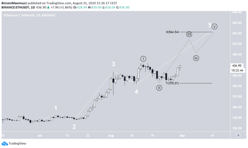 Na początku lipca cena Ethereum ostatecznie wybiła się z poziomu 360 USD, powyżej którego nie była notowana od lipca 2018 r. Przez kilka następnych tygodni cena potwierdziła ten poziom jako wsparcie. Jeśli cena ETH będzie nadal rosła, to następny obszar oporu znajdzie się w pobliżu 620 USD.