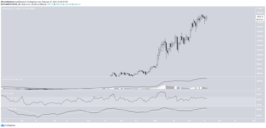 Wykres tygodniowy pokazuje, że ETH przebił się powyżej obszaru 1400 USD, który wcześniej działał jako opór z poprzedniego ATH. Jak dotąd ETH osiągnął szczyt na 1900 USD i jeszcze nie przetestował obszaru 1400 USD jako wsparcia.