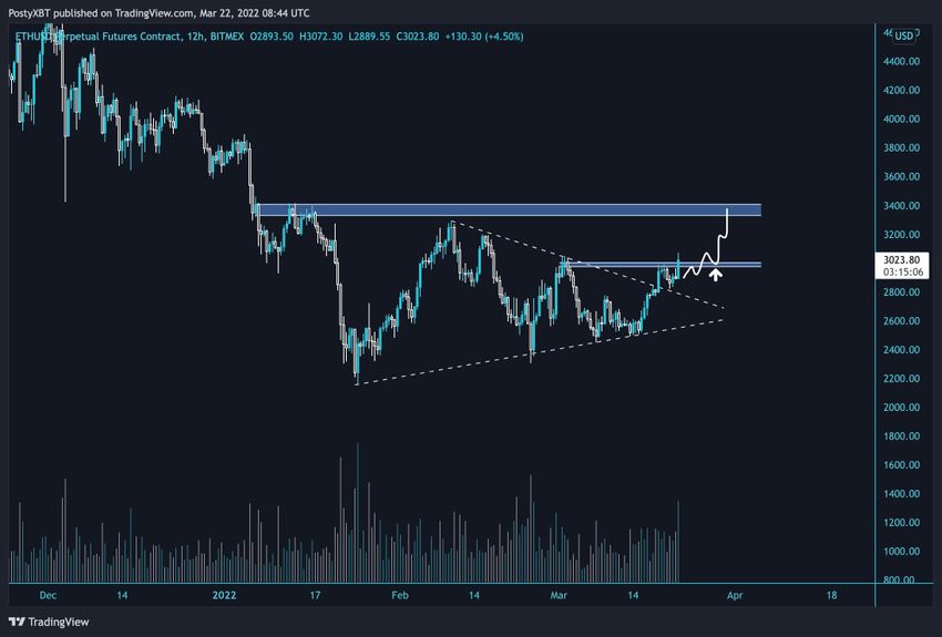 Inwestor kryptowalutowy @PostyXBT opublikował na Twitterze wykres Ethereum. Stwierdził, że bycze zamknięcie może doprowadzić cenę aż do poziomu 3400 USD.