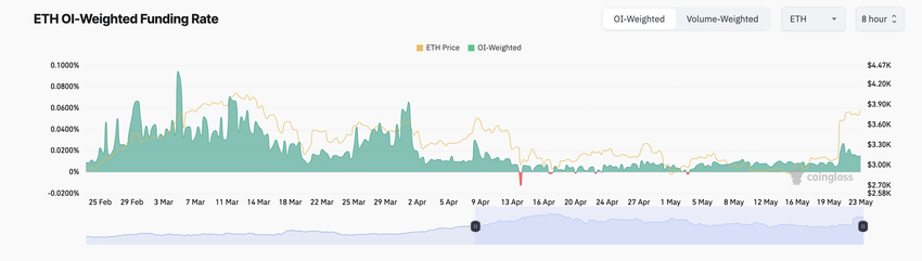 Ponadto wzrostowi otwartych pozycji kontraktów terminowych na ETH towarzyszy dodatnia stopa finansowania. W chwili pisania tego tekstu stopa finansowania ETH wynosiła 0,014%.