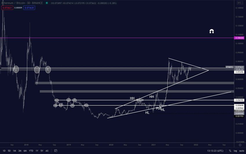 Trader kryptowalutowy @Pentosh1 nakreślił wykres ETH/BTC, stwierdzając, że token może przejść całą drogę aż do 0,1 BTC.