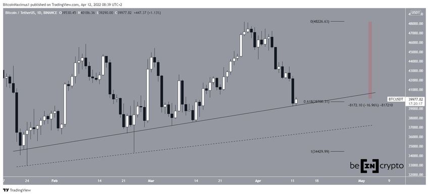 BTC spada od 28 marca. Ruch w dół doprowadził jak dotąd do dołka na poziomie 39 218 USD w dniu 11 kwietnia. Spowodowało to odbicie od rosnącej linii wsparcia i poziomu wsparcia przy zniesieniu 0,618 Fib na 39 700 USD.